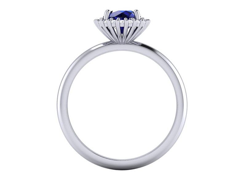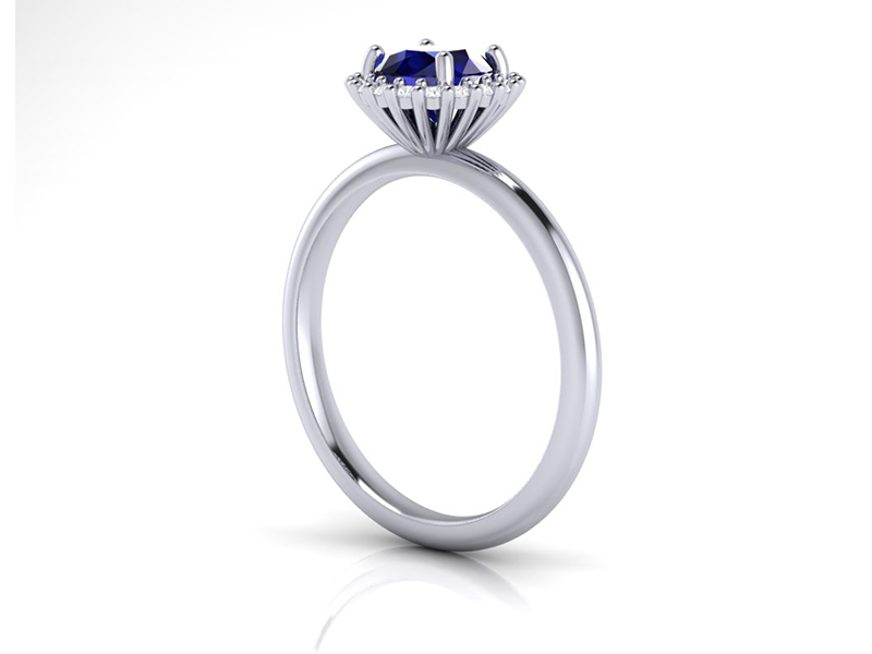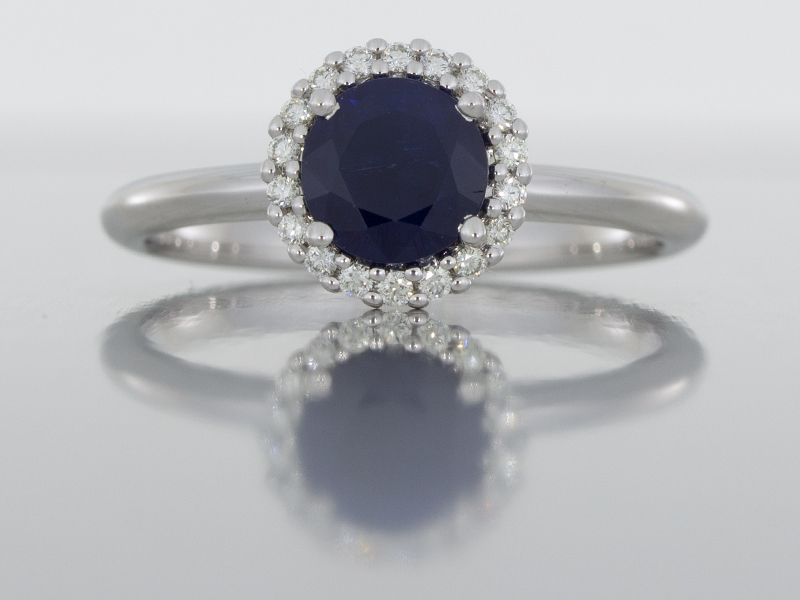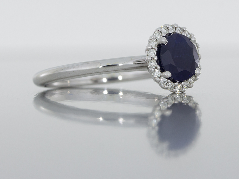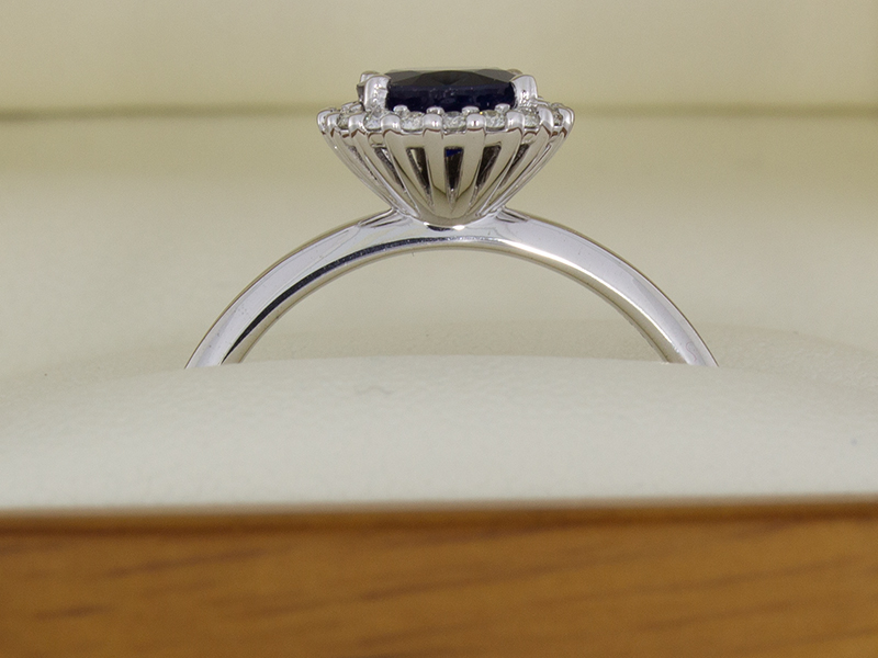 This classic 18k white gold ring has been designed to be wedding band friendly, set with a gorgeous blue sapphire and surrounded by a cluster of diamonds. It has a quiet vintage charm with a flair of personality to make it unique for the wearer.