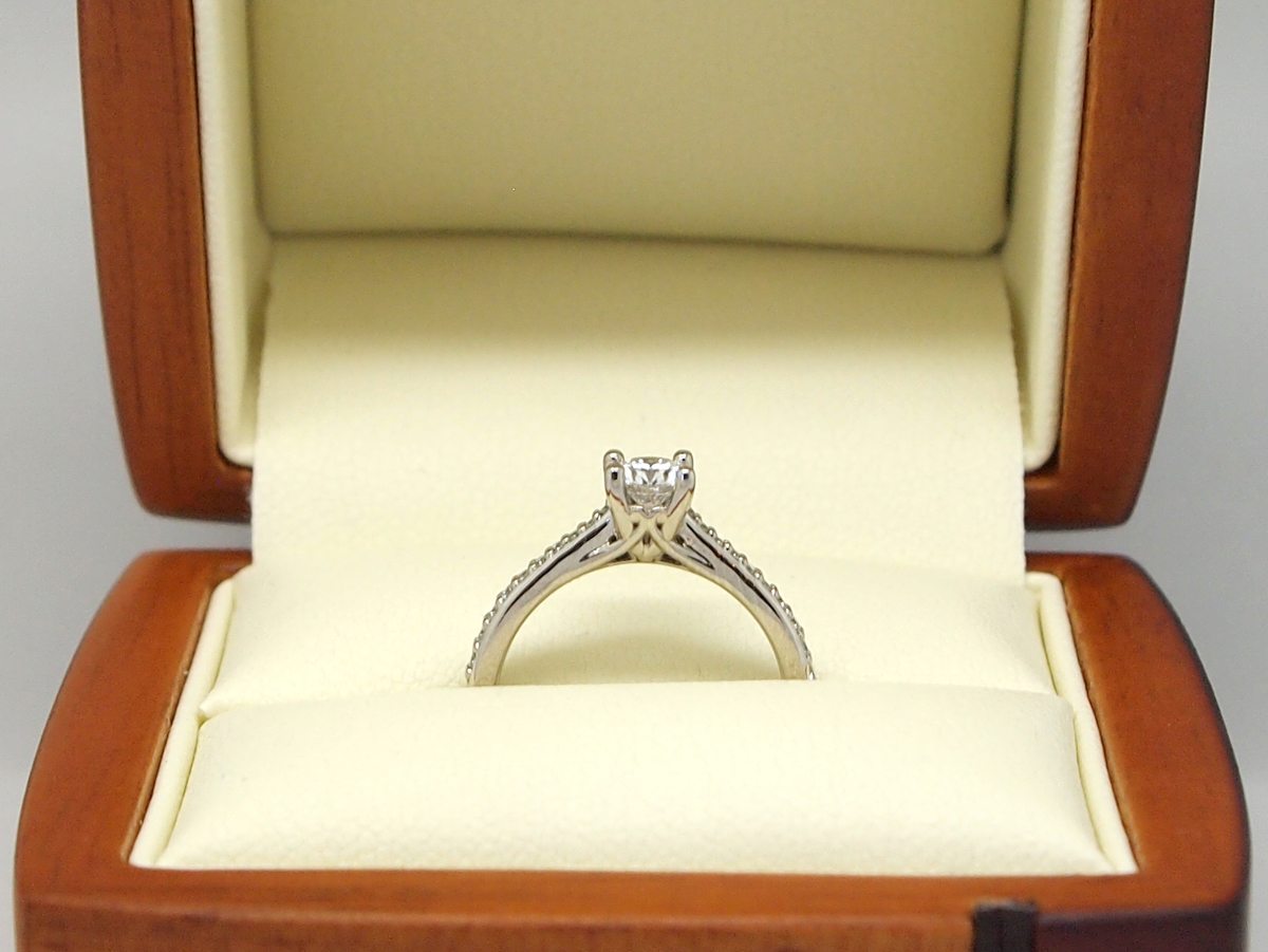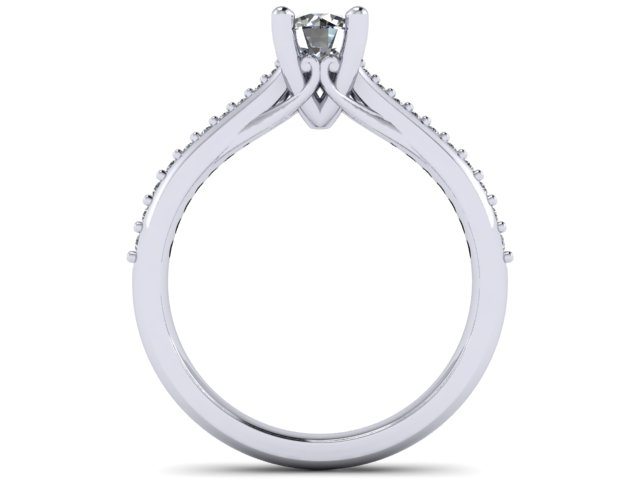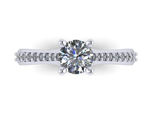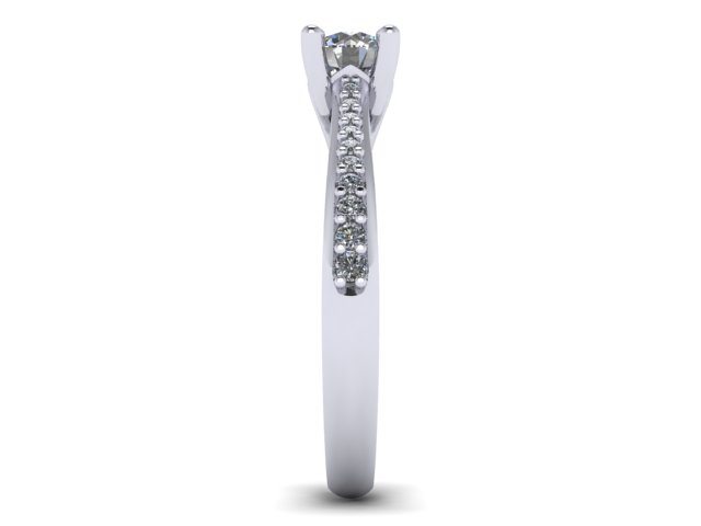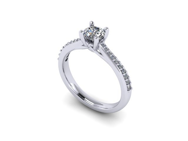 This 'Ring of the Week' was created in collaboration with a decisive client with a clear vision of a classic solitaire engagement ring design. We began with the centre diamond, which was a 0.32ct round cut brilliant stone. The ring needed to be practical fit for a very dainty finger size, so the height was set to approximately 5mm which allows for comfortable everyday wear. An under gallery detailing was used to taper in underneath the stone, adding an additional scroll-work detail to the ring. Ultimately it was decided that accent diamonds would be used, but would be kept fairly minimal. We achieved this by keeping these side diamonds fairly small and tapering them towards the centre cathedral setting. This gives a fine, delicate appearance. The precious metal chosen for the diamonds to be set on was palladium, allowing for a lighter, durable finish to be achieved.