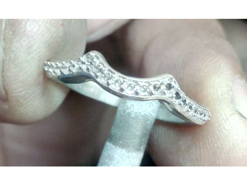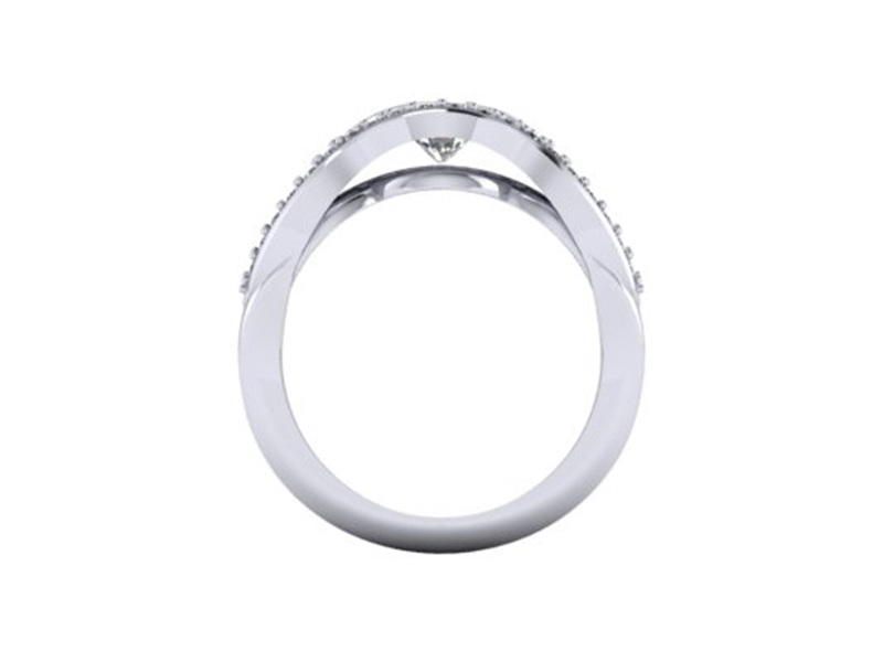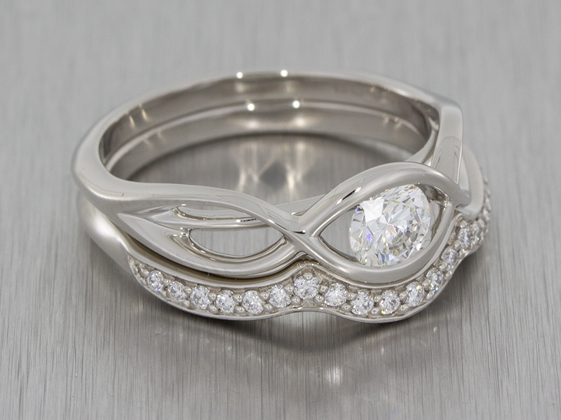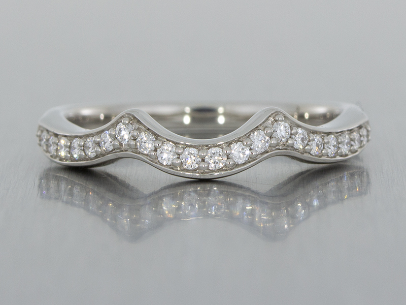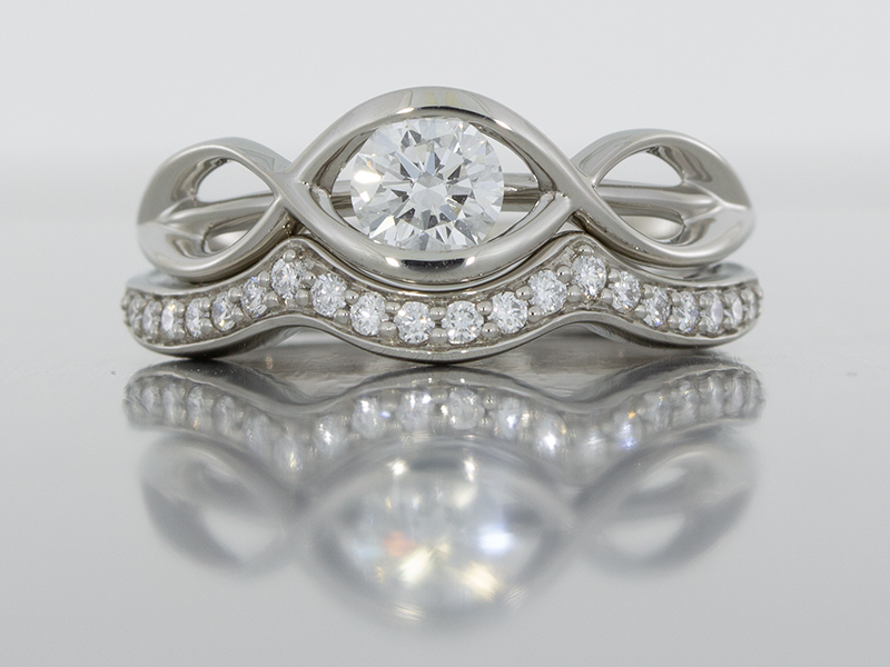We created a diamond set shadow band to sit perfectly next to this beautiful engagement ring. Using the same profile band enabled these two rings to come together as a perfect pair. The most unusual element with this design is the height, as we raised the diamond section to sit flush with the height of the centre stone in the engagement ring. This focuses the eye on both bands so they are viewed as a set rather than the engagement ring taking the lead.