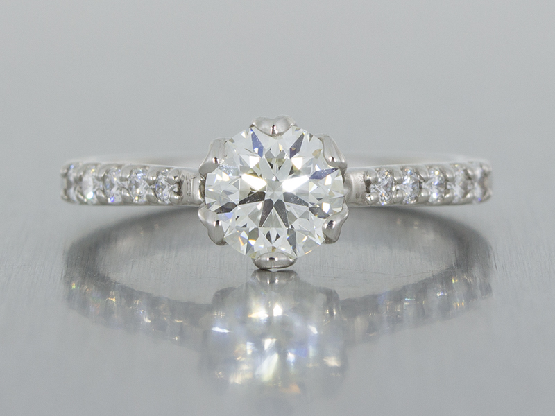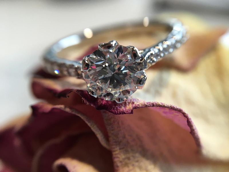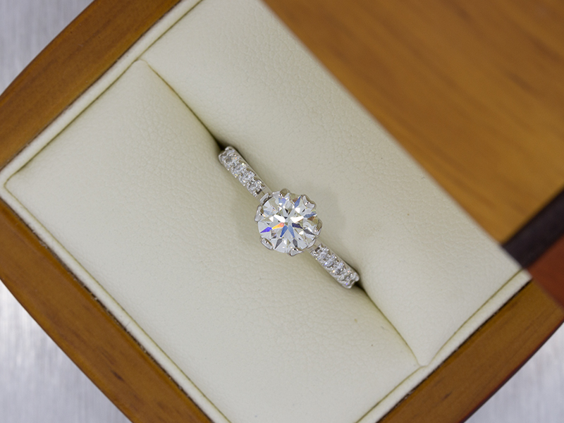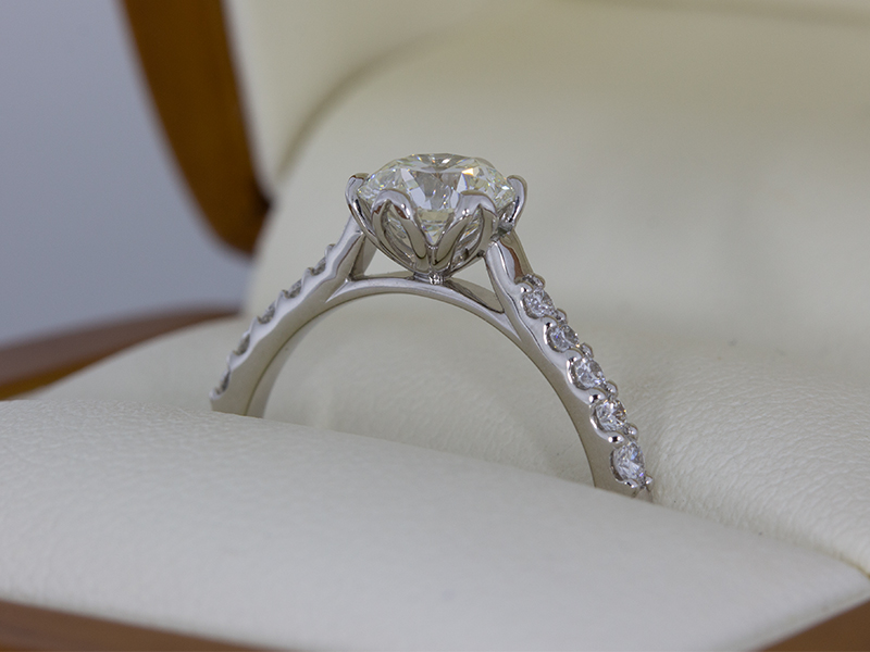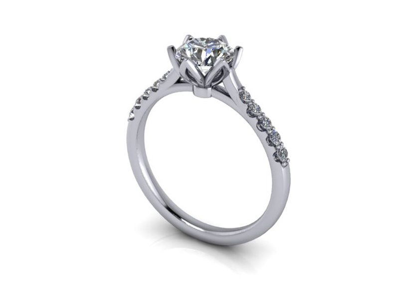 Our client was hoping to create something which was floral-inspired without being ornate. To achieve this, we created a petal outline that was arrayed around the centre stone to secure this beautiful 1ct diamond. In turn, this beautiful pattern created these beautifully shaped claws. The stones in the shoulder have been pave set to retain a delicate feel and enhance the diamonds for their optical performance