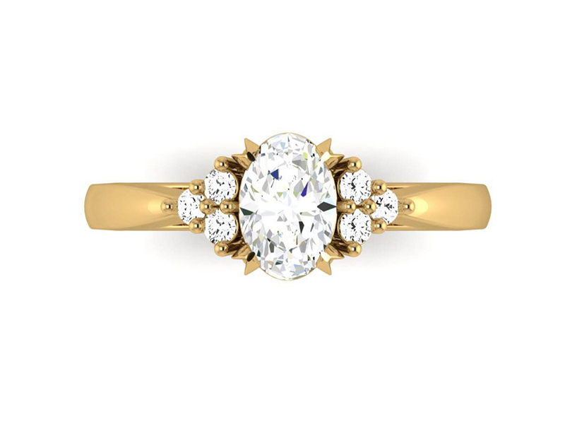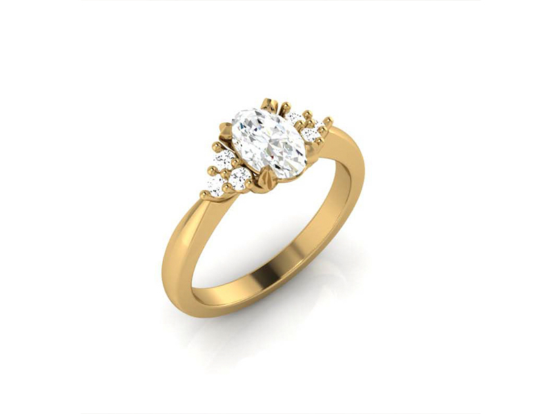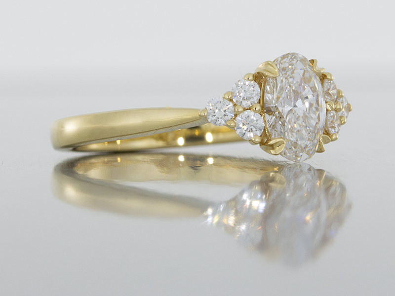 This elegant, organic style ring was crafted in 18k yellow gold, it was set with a splendid oval cut diamond nestled in organic leaf shape claws. On either side, a trilogy of small round diamonds beautifully accenting the sparkle of the centre stone, all set in a crossover entwined trellis setting.